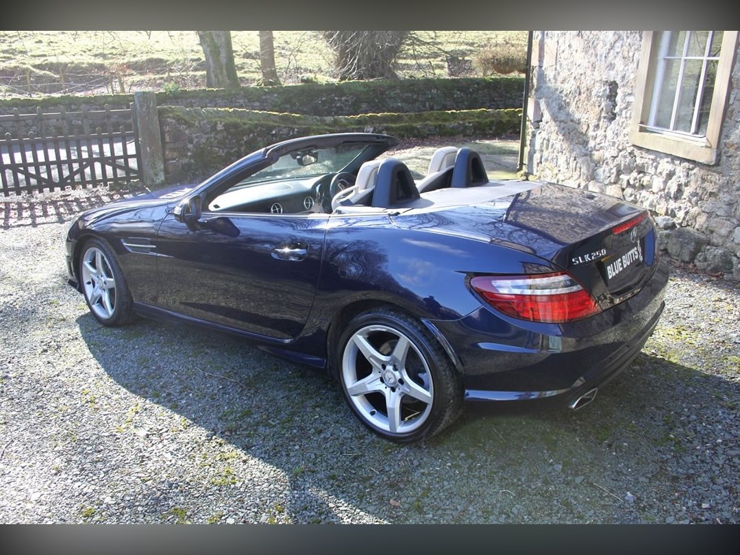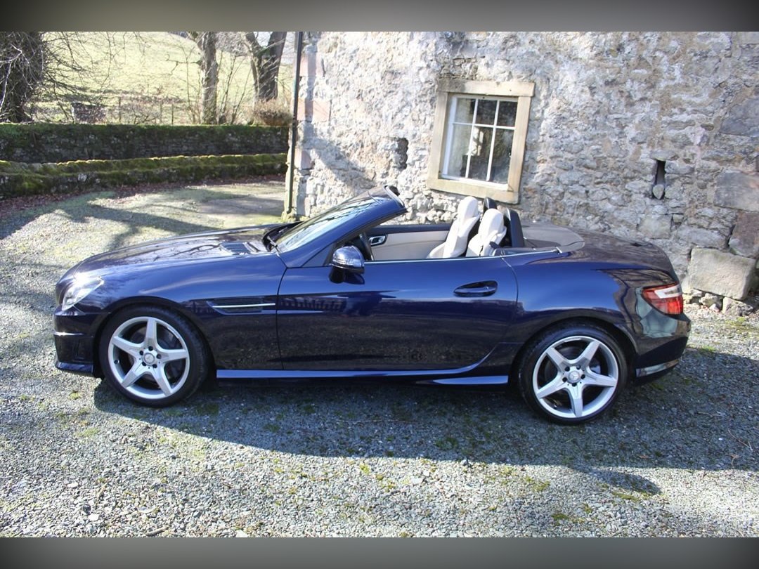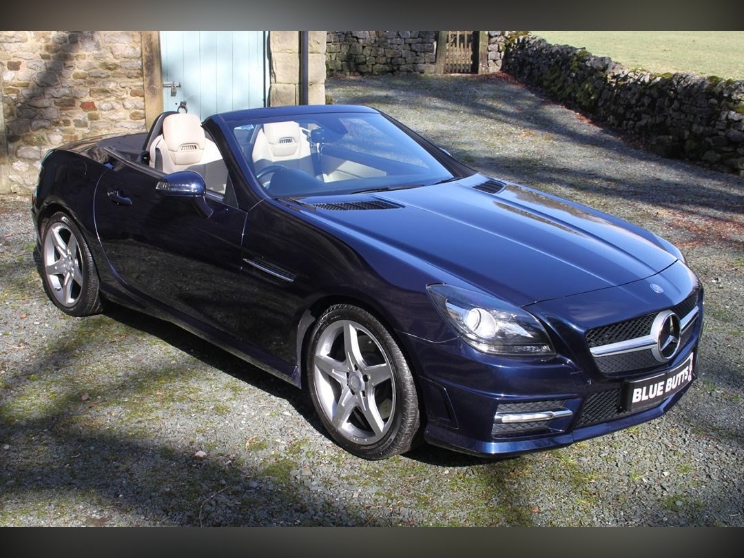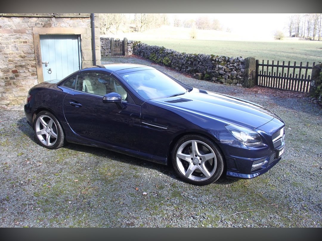 Mercedes Benz SLK250 (Petrol)2012 (12), Mercedes Sls have been one of the most stylish open topped Gran Tourers since the 1950s. A car to see and be seen in. The SLK was introduced in 1996 to broaden the range. And what a tremendous success the car has been. This car is a 2012 (12) SLK250. Its fitted with the 204BHP petrol power unit, so she goes really well. Finished in Nautic Blue with Ivory Hide interior. It's fitted with Electric Folding Roof, Electric Windows, Climate Control, Air Scarf, MB Command including Sat Nav. 18” AMG alloy wheels with recent tyres changed due to age rather than wear, it’s a truly fabulous spec car. It comes with full-service history having covered only 15,000 miles from new, and it previously belonged to the wife of a very well-known local sports personality. This is a car that truly wants for nothing. If you want the sophistication of Mercedes open topped motoring, then look no further. You won’t find a better example than this for only £13995